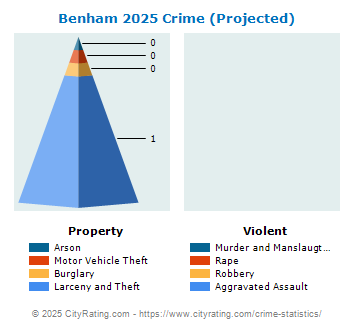 crime rate data displayed above was generated from the trends and crime data available from previous years of actual reported data. In this case, the Benham crime report data for 2025 was projected from 10 years of actual data. The last year of actual available crime data, as reported above, was 2016.