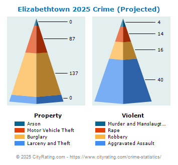 crime rate data displayed above was generated from the trends and crime data available from previous years of actual reported data. In this case, the Elizabethtown crime report data for 2025 was projected from 16 years of actual data. The last year of actual available crime data, as reported above, was 2019.