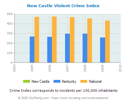 New Castle crime statistics report an overall downward trend in crime based on data from 5 years with violent crime increasing and property crime decreasing. Based on this trend, the crime rate in New Castle for 2025 is expected to be lower than in 2009.