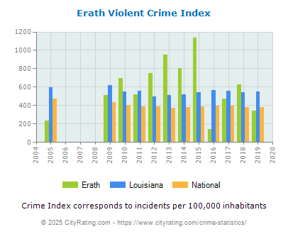 Erath crime statistics report an overall downward trend in crime based on data from 12 years with violent crime increasing and property crime decreasing. Based on this trend, the crime rate in Erath for 2025 is expected to be lower than in 2019.