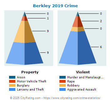 Berkley crime statistics report an overall downward trend in crime based on data from 15 years with violent crime decreasing and property crime decreasing. Based on this trend, the crime rate in Berkley for 2025 is expected to be lower than in 2019.