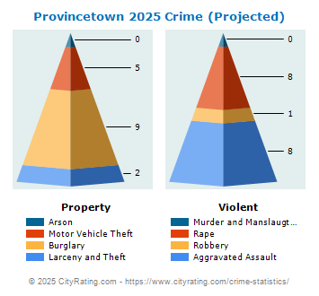 crime rate data displayed above was generated from the trends and crime data available from previous years of actual reported data. In this case, the Provincetown crime report data for 2025 was projected from 14 years of actual data. The last year of actual available crime data, as reported above, was 2019.