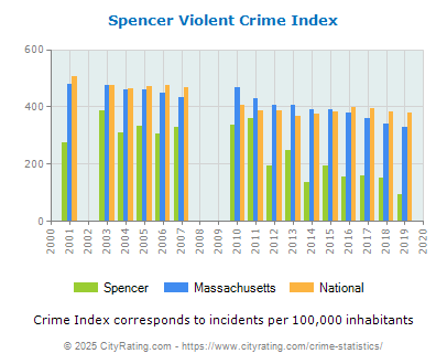 Spencer crime statistics report an overall downward trend in crime based on data from 17 years with violent crime decreasing and property crime decreasing. Based on this trend, the crime rate in Spencer for 2025 is expected to be lower than in 2019.
