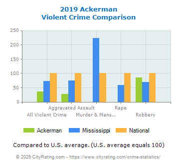 In 2019 the city violent crime rate in Ackerman was lower than the