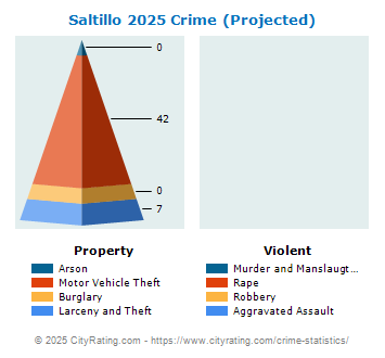 crime rate data displayed above was generated from the trends and crime data available from previous years of actual reported data. In this case, the Saltillo crime report data for 2025 was projected from 2 years of actual data. The last year of actual available crime data, as reported above, was 2012.