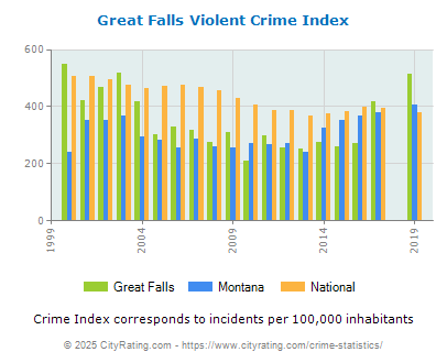 In 2019 the city violent crime rate in Great Falls was higher than the