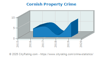 Cornish crime statistics report an overall upward trend in crime based on data from 4 years with violent crime increasing and property crime increasing. Based on this trend, the crime rate in Cornish for 2025 is expected to be higher than in 2019.