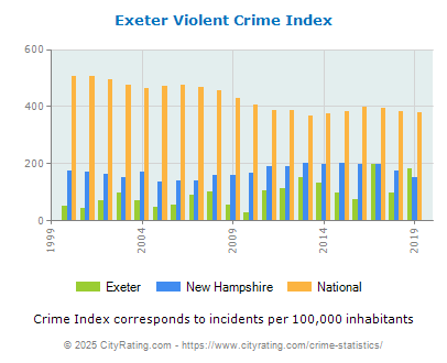 Exeter crime statistics report an overall downward trend in crime based on data from 20 years with violent crime increasing and property crime decreasing. Based on this trend, the crime rate in Exeter for 2025 is expected to be lower than in 2019.