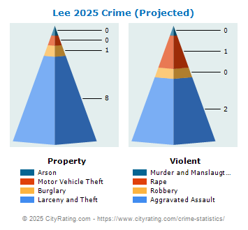 crime rate data displayed above was generated from the trends and crime data available from previous years of actual reported data. In this case, the Lee crime report data for 2025 was projected from 14 years of actual data. The last year of actual available crime data, as reported above, was 2019.