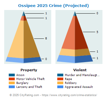crime rate data displayed above was generated from the trends and crime data available from previous years of actual reported data. In this case, the Ossipee crime report data for 2025 was projected from 15 years of actual data. The last year of actual available crime data, as reported above, was 2019.