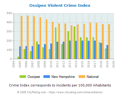 In 2019 the city violent crime rate in Ossipee was lower than the