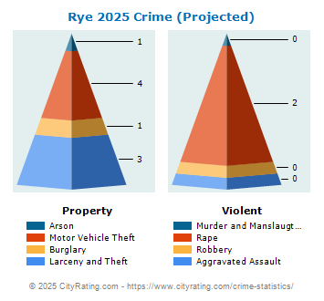 crime rate data displayed above was generated from the trends and crime data available from previous years of actual reported data. In this case, the Rye crime report data for 2025 was projected from 14 years of actual data. The last year of actual available crime data, as reported above, was 2019.