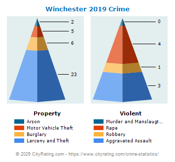 crime rate data displayed above was generated from the trends and crime data available from previous years of actual reported data. In this case, the Winchester crime report data for 2025 was projected from 11 years of actual data. The last year of actual available crime data, as reported above, was 2019.