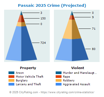 crime rate data displayed above was generated from the trends and crime data available from previous years of actual reported data. In this case, the Passaic crime report data for 2025 was projected from 21 years of actual data. The last year of actual available crime data, as reported above, was 2019.