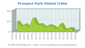 Prospect Park crime statistics report an overall downward trend in crime based on data from 15 years with violent crime decreasing and property crime decreasing. Based on this trend, the crime rate in Prospect Park for 2025 is expected to be lower than in 2019.