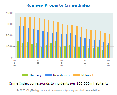 Ramsey crime statistics report an overall downward trend in crime based on data from 21 years with violent crime decreasing and property crime decreasing. Based on this trend, the crime rate in Ramsey for 2025 is expected to be lower than in 2019.