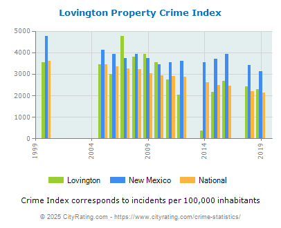 Lovington crime statistics report an overall downward trend in crime based on data from 14 years with violent crime decreasing and property crime decreasing. Based on this trend, the crime rate in Lovington for 2025 is expected to be lower than in 2019.