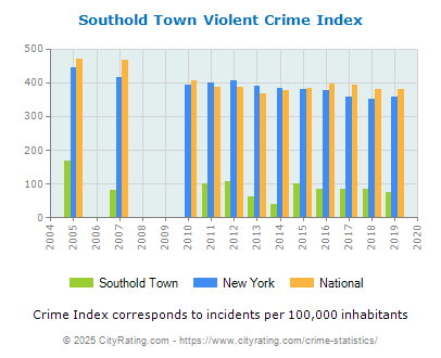 In 2019 the city violent crime rate in Southold Town was lower than the