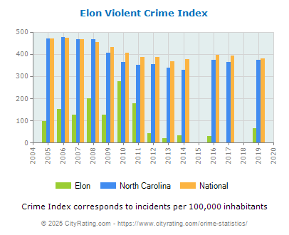 In 2019 the city violent crime rate in Elon was lower than the