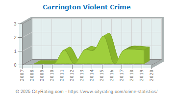Carrington crime statistics report an overall upward trend in crime based on data from 11 years with violent crime increasing and property crime increasing. Based on this trend, the crime rate in Carrington for 2025 is expected to be higher than in 2019.