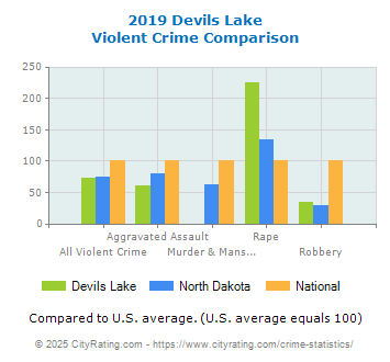 In 2019 the city violent crime rate in Devils Lake was lower than the