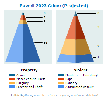 crime rate data displayed above was generated from the trends and crime data available from previous years of actual reported data. In this case, the Powell crime report data for 2025 was projected from 13 years of actual data. The last year of actual available crime data, as reported above, was 2019.