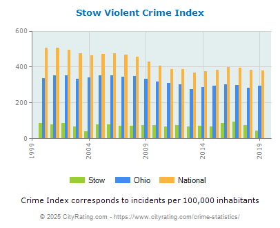 Stow crime statistics report an overall downward trend in crime based on data from 21 years with violent crime increasing and property crime decreasing. Based on this trend, the crime rate in Stow for 2025 is expected to be lower than in 2019.