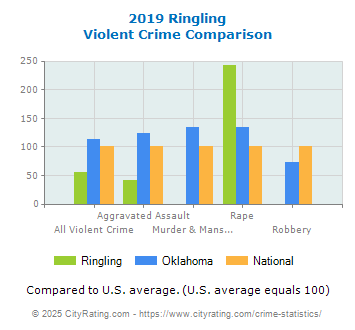 Ringling crime statistics report an overall upward trend in crime based on data from 15 years with violent crime increasing and property crime increasing. Based on this trend, the crime rate in Ringling for 2025 is expected to be higher than in 2019.