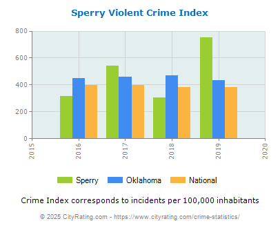 Sperry crime statistics report an overall upward trend in crime based on data from 4 years with violent crime increasing and property crime decreasing. Based on this trend, the crime rate in Sperry for 2025 is expected to be higher than in 2019.