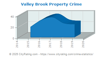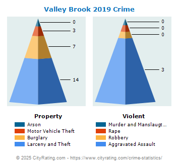 crime rate data displayed above was generated from the trends and crime data available from previous years of actual reported data. In this case, the Valley Brook crime report data for 2025 was projected from 5 years of actual data. The last year of actual available crime data, as reported above, was 2019.