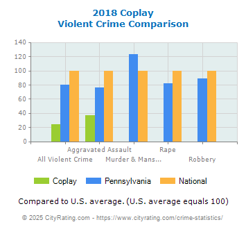 The city violent crime rate for Coplay in 2018 was lower than the national violent crime rate average by 75.92% and the city property crime rate in Coplay was lower than the national property crime rate average by 52.79%.