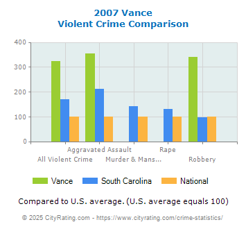Vance crime statistics report an overall upward trend in crime based on data from 3 years with violent crime increasing and property crime increasing. Based on this trend, the crime rate in Vance for 2025 is expected to be higher than in 2007.