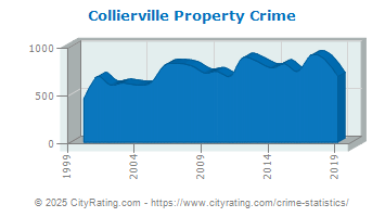 The city violent crime rate for Collierville in 2019 was lower than the national violent crime rate average by 38.83% and the city property crime rate in Collierville was lower than the national property crime rate average by 36.4%.