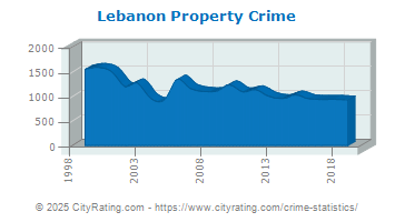 The city violent crime rate for Lebanon in 2019 was higher than the national violent crime rate average by 8.07% and the city property crime rate in Lebanon was higher than the national property crime rate average by 21.17%.