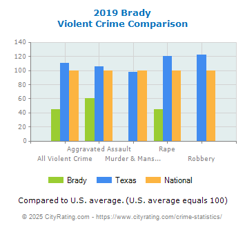 Brady crime statistics report an overall downward trend in crime based on data from 15 years with violent crime decreasing and property crime decreasing. Based on this trend, the crime rate in Brady for 2025 is expected to be lower than in 2019.