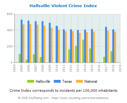 In 2018 the city violent crime rate in Hallsville was lower than the