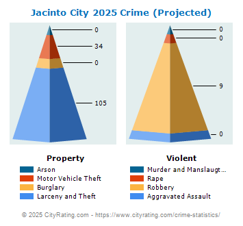 crime rate data displayed above was generated from the trends and crime data available from previous years of actual reported data. In this case, the Jacinto City crime report data for 2025 was projected from 19 years of actual data. The last year of actual available crime data, as reported above, was 2019.