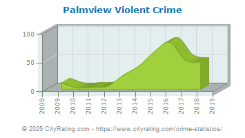 Palmview crime statistics report an overall upward trend in crime based on data from 10 years with violent crime increasing and property crime decreasing. Based on this trend, the crime rate in Palmview for 2025 is expected to be higher than in 2018.