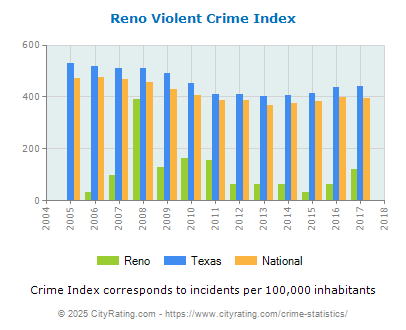 Reno crime statistics report an overall downward trend in crime based on data from 13 years with violent crime decreasing and property crime decreasing. Based on this trend, the crime rate in Reno for 2025 is expected to be lower than in 2017.