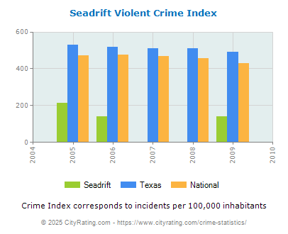 The city violent crime rate for Seadrift in 2009 was lower than the