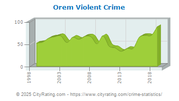 Orem crime statistics report an overall downward trend in crime based on data from 21 years with violent crime increasing and property crime decreasing. Based on this trend, the crime rate in Orem for 2025 is expected to be lower than in 2019.