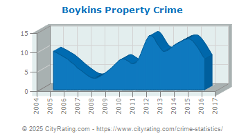 Boykins crime statistics report an overall upward trend in crime based on data from 12 years with violent crime decreasing and property crime increasing. Based on this trend, the crime rate in Boykins for 2025 is expected to be higher than in 2016.