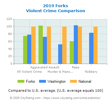 Forks crime statistics report an overall downward trend in crime based on data from 14 years with violent crime decreasing and property crime decreasing. Based on this trend, the crime rate in Forks for 2025 is expected to be lower than in 2019.