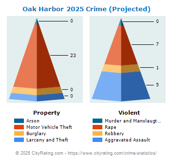 crime rate data displayed above was generated from the trends and crime data available from previous years of actual reported data. In this case, the Oak Harbor crime report data for 2025 was projected from 18 years of actual data. The last year of actual available crime data, as reported above, was 2019.
