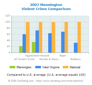 crime rate data displayed above was generated from the trends and crime data available from previous years of actual reported data. In this case, the Mannington crime report data for 2025 was projected from 2 years of actual data. The last year of actual available crime data, as reported above, was 2007.
