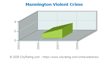 Mannington crime statistics report an overall downward trend in crime based on data from 2 years with violent crime increasing and property crime decreasing. Based on this trend, the crime rate in Mannington for 2025 is expected to be lower than in 2007.