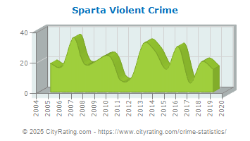 Sparta crime statistics report an overall downward trend in crime based on data from 14 years with violent crime decreasing and property crime decreasing. Based on this trend, the crime rate in Sparta for 2025 is expected to be lower than in 2019.