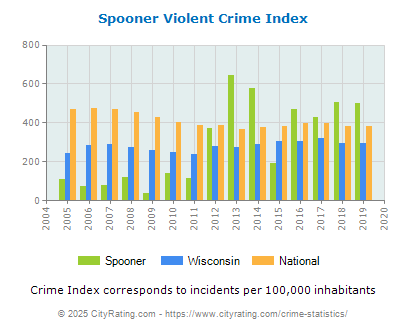 Spooner crime statistics report an overall downward trend in crime based on data from 15 years with violent crime increasing and property crime decreasing. Based on this trend, the crime rate in Spooner for 2025 is expected to be lower than in 2019.
